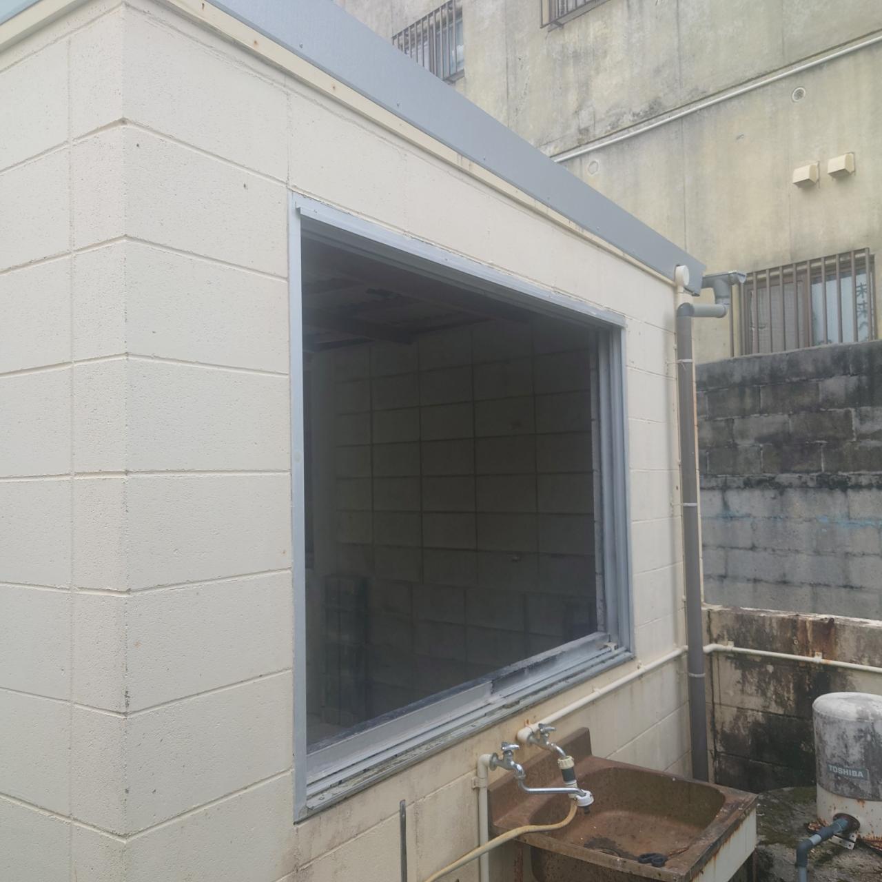 与那原町にてM様より、今ついているサッシを取外し、別の建物へ移動(取付)したいと要望。 現調確認。 現在ついているサッシを斫り移動するより、新設で取付けた方が安いと提案。 見積書提出します。