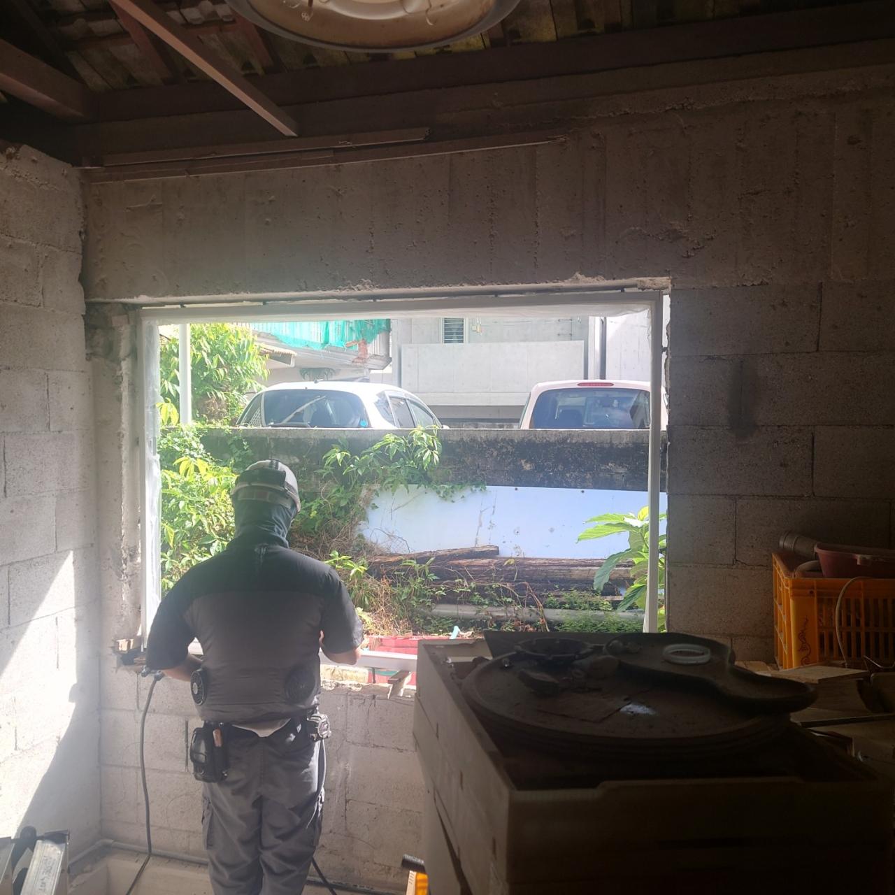 昨日は朝から与那原のM様工房にて、アルミ引違い窓新設取付け。 4方溶接。 モルタルは家主様が自分で施工すると言う事で、障子にガラスを入れ、網戸も一緒に取付けしました。